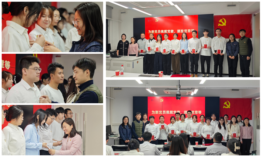 “当我把党徽戴上,使命在胸前发光”,伴随着音乐《把党徽戴上》,徐凌玉、张帅亲手为每位新党员佩戴上闪亮的党徽。随后,秦思阳为党员颁发《中国共产党党章》《中国共产党纪律处分条例》。这一递一接之间,传递的是嘱托,是传承,更是老党员对新同志的殷切期望。