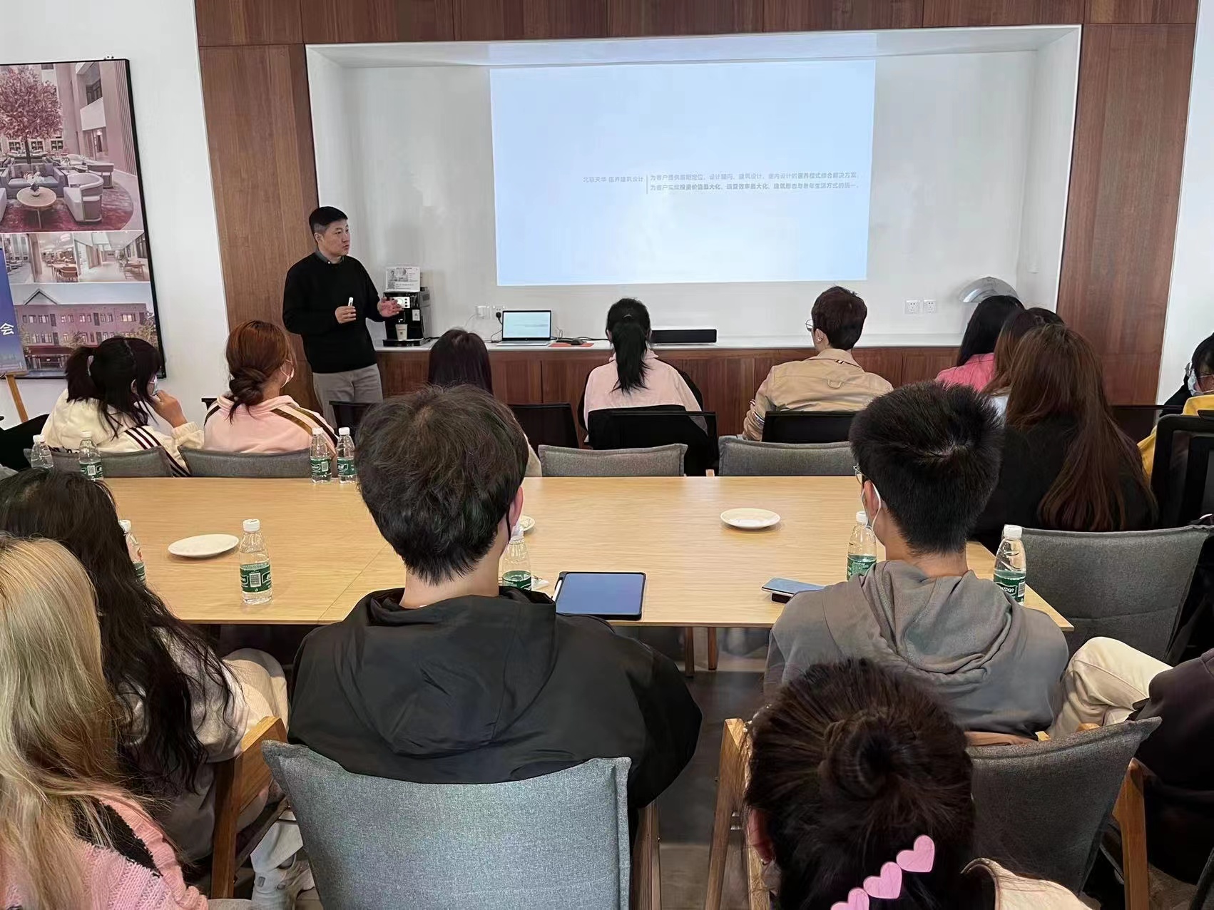 北京天华总经理闫锋对公司师生的来访表示热烈欢迎,并对天华的建立、研究方向、营业范围、设计优秀案例、就业待遇等几个主要方面进行了详细的介绍,副总建筑师蔡俊结合天华实战案例,介绍了近年来的热点话题——康养类建筑设计、室内外设计,以及软装设计,同时详细讲解了近几年天华优秀医养项目的设计理念与成效反馈,并对医养项目设计市场的未来与发展提出分析与展望。