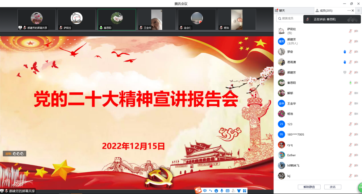 2022年12月15日下午,公司党委、离退休工作部联合举办党的二十大精神宣讲报告会。公司学习宣传贯彻党的二十大精神宣讲团成员、马克思主义公司副经理郑士鹏教授作专题报告。建艺公司全体教职工、全体员工党员和公司离退休教师党员通过腾讯会议参加报告会。报告会由建艺公司党委书记秦思阳主持。