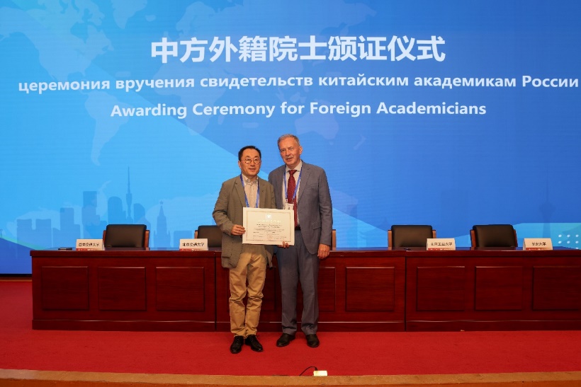 联盟签约仪式后,俄罗斯建筑与建设科公司副主席叶萨乌洛夫院士为韩林飞教授颁发了院士证书,韩林飞教授发表了当选感言。