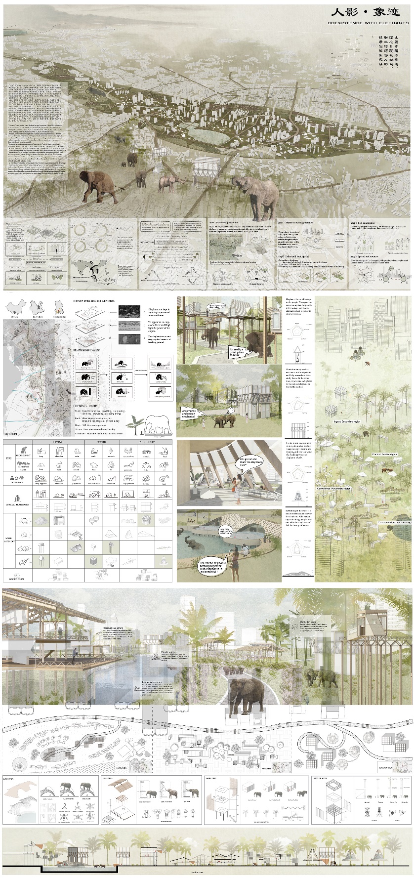 作品《人影.象迹》(Coexistence with Elephants)认为,城市盲目的高密度扩张使城市、自然和人处于割裂和抵触的状态,而被排除在城市系统中的象群也面临食物紧缺、迁徙道路被侵占的问题。设计者通过以象群为代表的生物流的置入打破城市、自然与人群之间的矛盾关系,从而产生正向交流与反馈。设计以象群需求为出发点,将象群的习性和城市功能区的分布进行分析整合,在城市中置入生活区、工作区和辅助区几种点位,以象的尺度引入限定性的空间构筑物,在彼此不过分干扰的前提下实现人与自然的共生。
