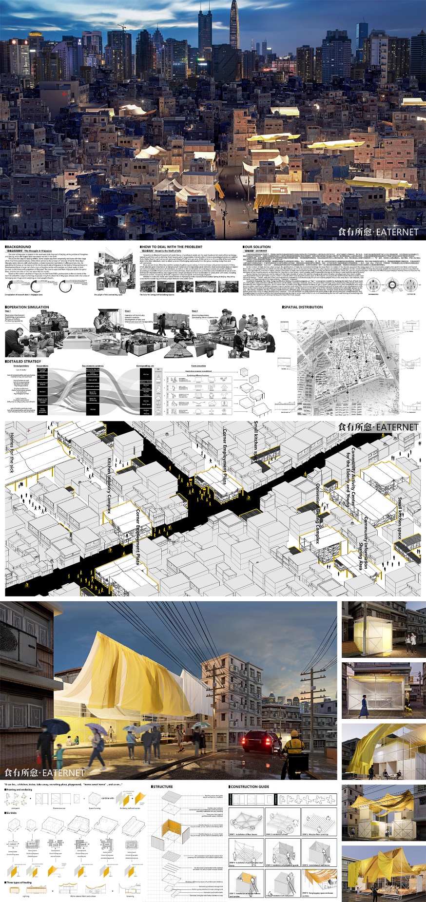作品《食有所愈》(Eaternet)关注蜗居在城中村、远离家乡和亲人的低收入务工人群心理健康问题。设计灵感来源于病友厨房互助组织,选址通州区马驹桥镇,提出从人类最本质的需求——“吃”出发,在低收入人群的日常生活中构建以餐饮为导向的新社交网络“Eaternet”。通过研究务工人群的日常生活,针对6种人群提出“吃+”建造模块,采取低造价、可迅速搭建的更新策略,并且编写模块搭建手册,使务工人群能够参与到社区的共同建设中来,完成由旁观者、到参与者再到使用者的身份转变,将食物社交的温暖与疗愈转化成更多人心底坚定希望与美好的基石。