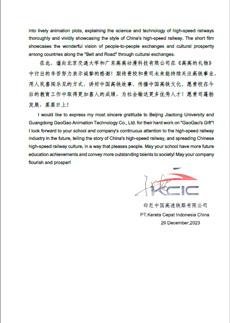 近日,公司收到来自印尼中国高速铁路有限公司的感谢信,对建艺公司与校企合作单位以雅万高铁为主题共同创作的动画片《高高的礼物》给予高度评价和诚挚感谢!
