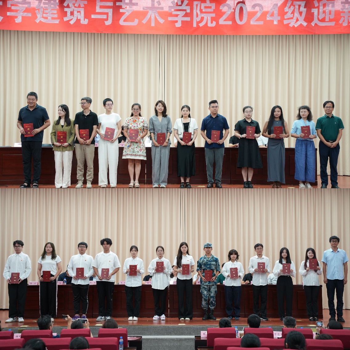 建规2401班拓心月、建规2402班王煜博、建规2403班王巍、设计2403班宋初阳作为2024级新生代表带来朗诵《青春扬帆正当时,争做时代追梦人》,表达了新生在人生新阶段的坚定信念和勇敢追梦的决心,充分展现了新一代建艺人的蓬勃生机与无限活力。