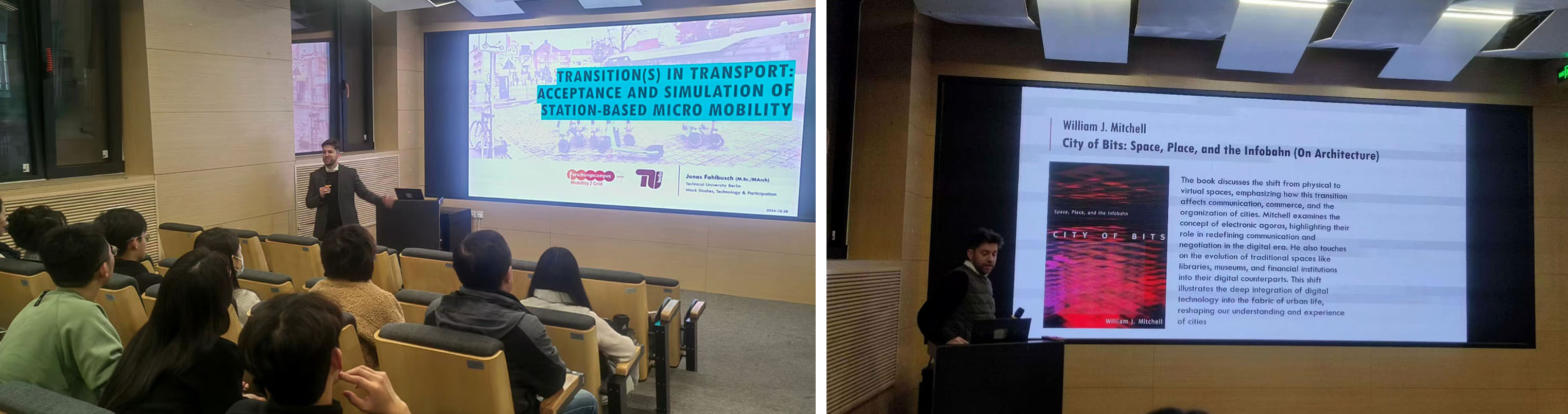 2024年10月28日-11月6日,建艺公司设计系“2024年中德高校智慧城市设计研究生教学实践与交流”项目负责人魏泽崧老师邀请德国柏林工大智慧城市研究所“Mobility2Grid德国城市战略”项目主持人Jonas Fahlbusch博士,为研究生进行了《交通规划设计的未来机遇与局限》、《城市与景观规划中的开放数据》等多个专题的授课与讲座。
