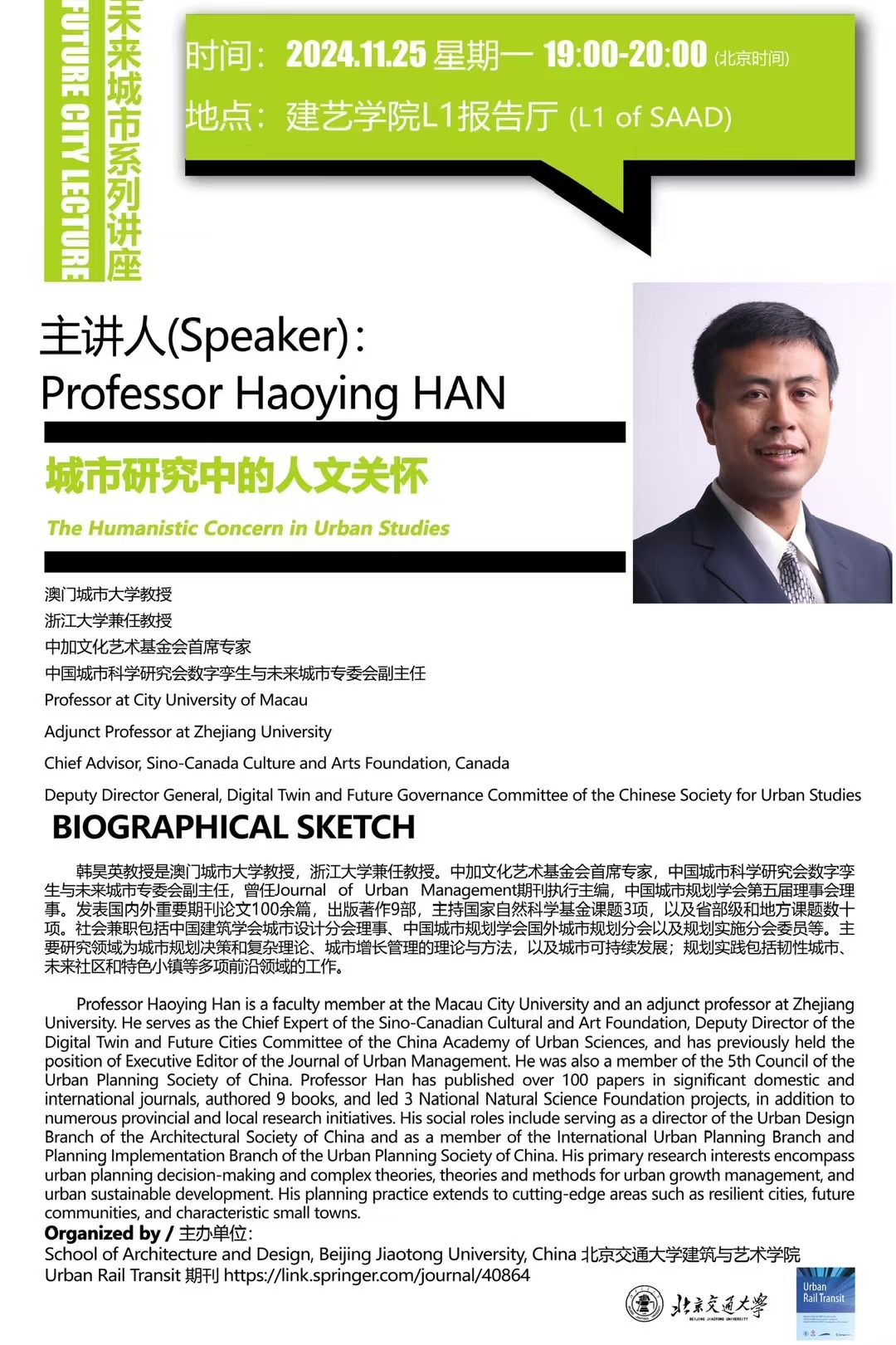 11月25日,公司邀请澳门城市大学创新设计公司韩昊英教授讲座“未来城市系列讲座:城市研究中的人文关怀”讲座。本次讲座聚焦于城市发展研究中的人文关怀,吸引了众多老师和同学们的积极参与。通过深入探讨以往城市研究中常被忽视的人文要素,为城市规划提供了新的视角。